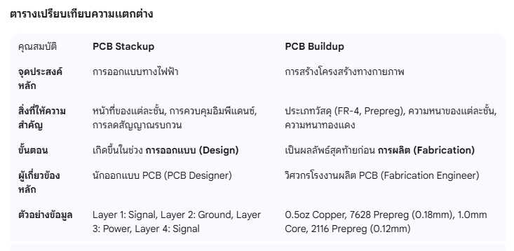 โดยสรุป Stackup คือ “แบบแปลน” ที่เน้นด้านไฟฟ้าและการทำงานของแต่ละชั้น ในขณะที่ Buildup คือ “โครงสร้างทางกายภาพ” ที่ระบุวัสดุและความหนาที่ใช้สร้าง PCB ตามแบบแปลนนั้น