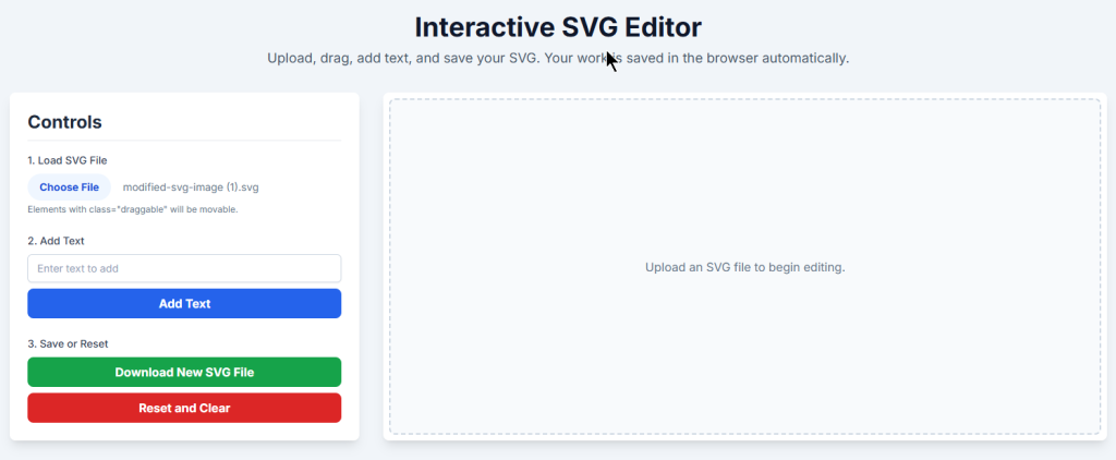 <p class="mt-2 text-lg text-slate-600">Upload, drag, add text, and save your SVG. Your work is saved in the browser automatically.</p>