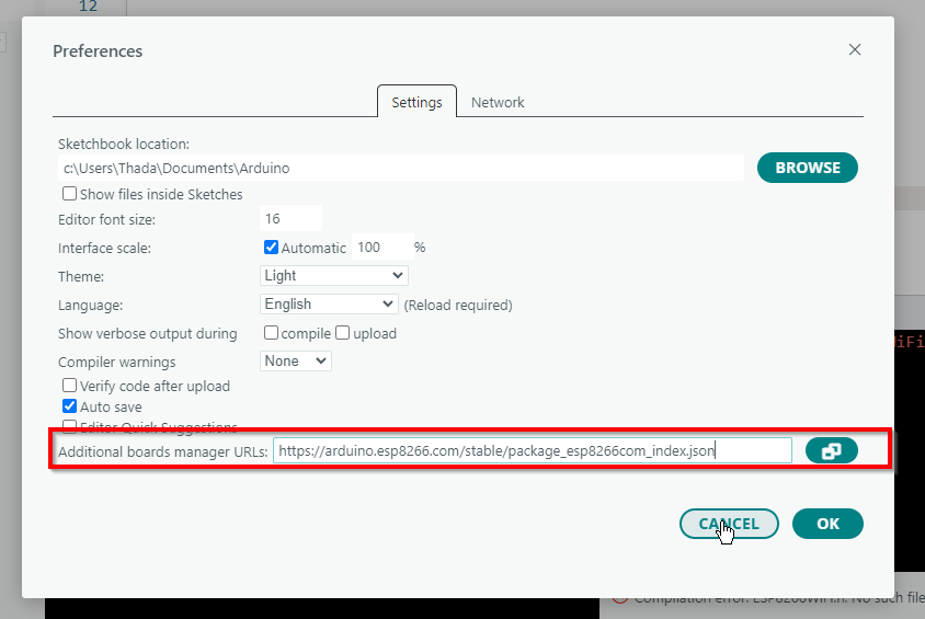 ซึ่งเราต้องสั่งให้มันไปเอามาจากไฟล์ภายนอก ที่ https://arduino.esp8266.com/stable/package_esp8266com_index.json